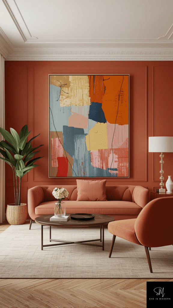 Finish the look with simple decor. A mirror, a sleek shelf, or one large artwork works best. Avoid clutter so the wall can shine. Lighting also matters. Use warm light to soften the bold color and create a cozy mood in the space.