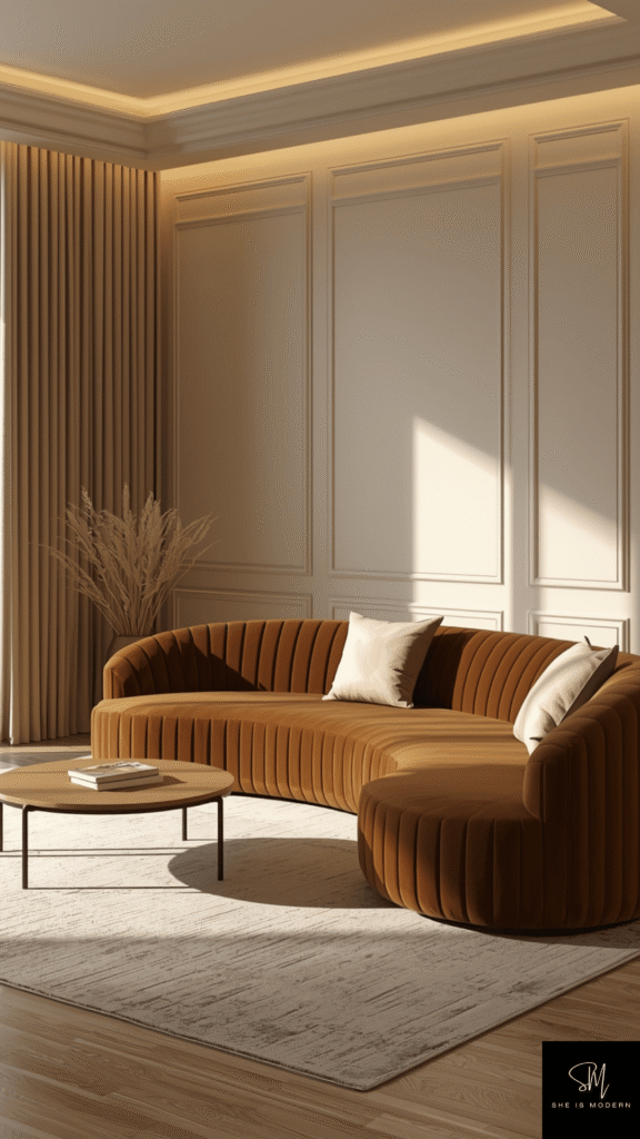 Pair curved furniture with clean lines. This mix creates balance and keeps the room from looking too soft. Add a textured rug or sleek lighting to complete the look. The result feels modern, stylish, and easy to live in.