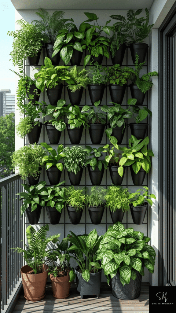 A vertical plant wall is one of the best ways to use a small balcony. Instead of taking up floor space, you grow plants upward. You can use wall mounted planters, hanging pots, or a simple wooden frame. This keeps your balcony open and gives it a lush green look without making it feel tight.