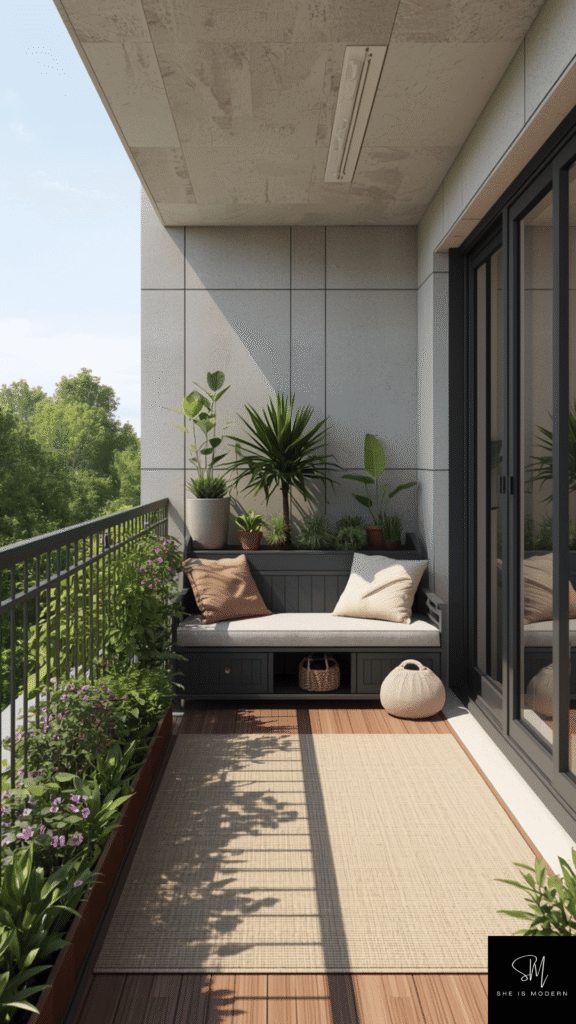 Keep the design simple and balanced. Don’t add too many items. A mix of plants and one main function is enough. This idea helps you enjoy your balcony in multiple ways while keeping it clean, stylish, and comfortable.