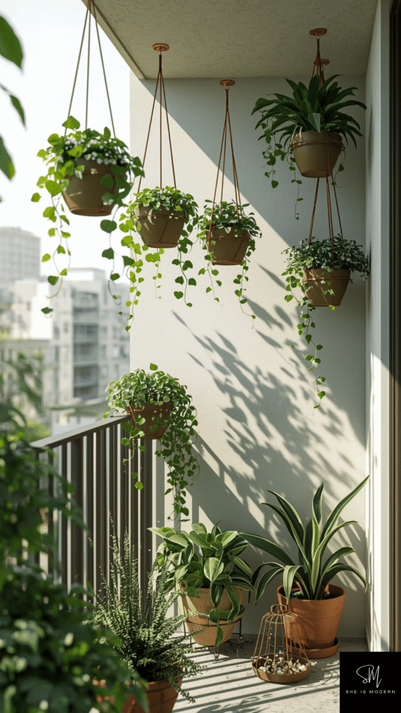 Hanging planters are perfect for small balconies. They use upper space and keep the floor free. You can hang them from the ceiling, railing, or hooks on the wall. This creates a floating garden feel that looks light and airy.