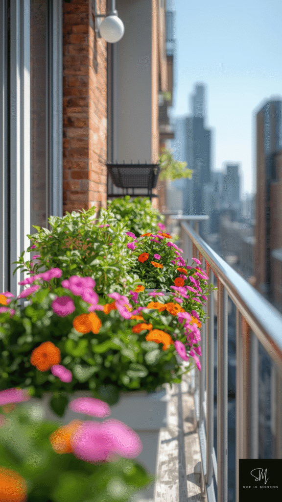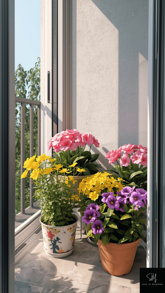 Mix different flower colors for a lively look, or stick to one color for a clean and elegant style. Place pots on the floor, railing, or small shelves to create layers. This helps your balcony look full without feeling crowded. Choose lightweight pots so they are easy to move and arrange.
