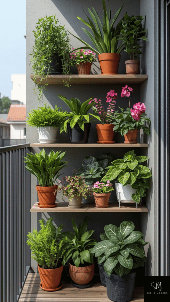 Keep the shelf close to a wall for stability. Make sure all plants get enough sunlight by adjusting their placement. Avoid overcrowding each level so plants have room to grow. This idea makes your balcony look green, layered, and visually interesting.