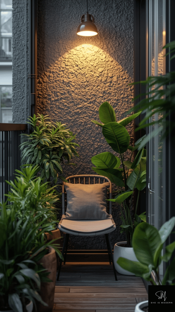 Turn one corner of your balcony into a small garden escape. Use that space to group a few plants together and create a relaxing vibe. Add a small chair, cushion, or floor seating to make it feel cozy and personal. This setup is perfect for quiet moments.