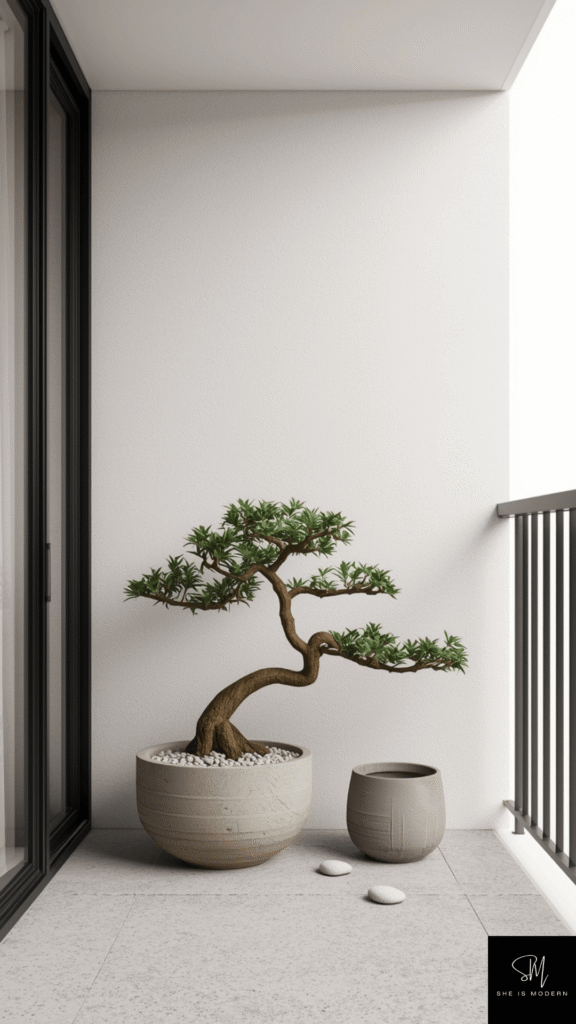 A Zen style balcony garden focuses on simplicity and calm. Use fewer plants and keep the layout clean. Choose neutral pots, natural materials, and simple shapes. This creates a peaceful and clutter free environment.