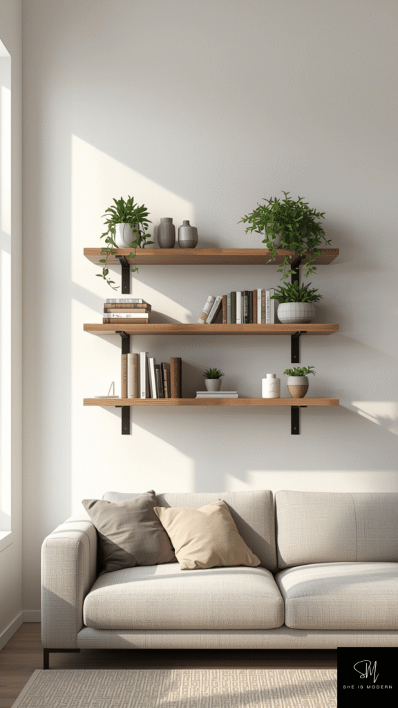Choose wood shelves with black brackets for an industrial look, or explore these industrial design ideas you’ll love to create a more cohesive and modern space. Keep styling simple with a mix of books, small decor, and plants. Leave some empty space so it doesn’t feel crowded.