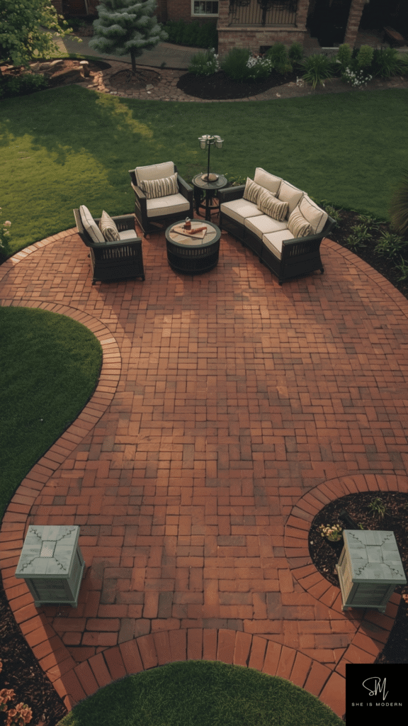 A classic brick pattern patio is timeless and works beautifully in almost any backyard. This style uses rectangular pavers arranged in running bond, herringbone, or basket weave patterns. The clean lines create structure while still feeling warm and inviting. Brick tones like red, brown, tan, or soft gray blend well with gardens, lawns, and traditional homes. It is a smart choice if you want a patio that stays stylish for many years.