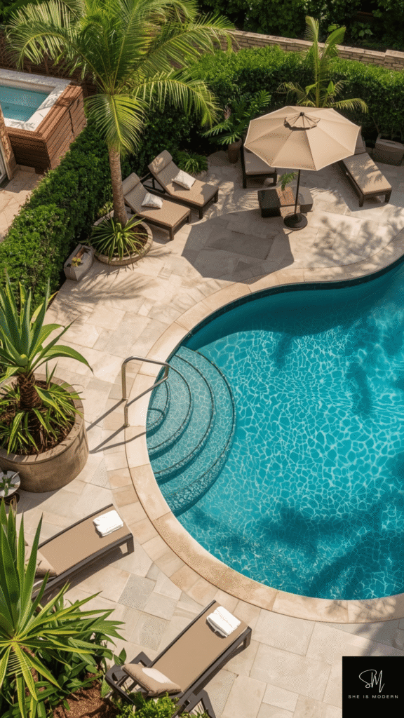 Use enough patio space for lounge chairs, side tables, and walking paths around the pool. Add umbrellas, palms, or planters for a vacation feel. If space allows, include a shaded sitting area or dining table nearby. Choose pavers with texture for better traction when wet.