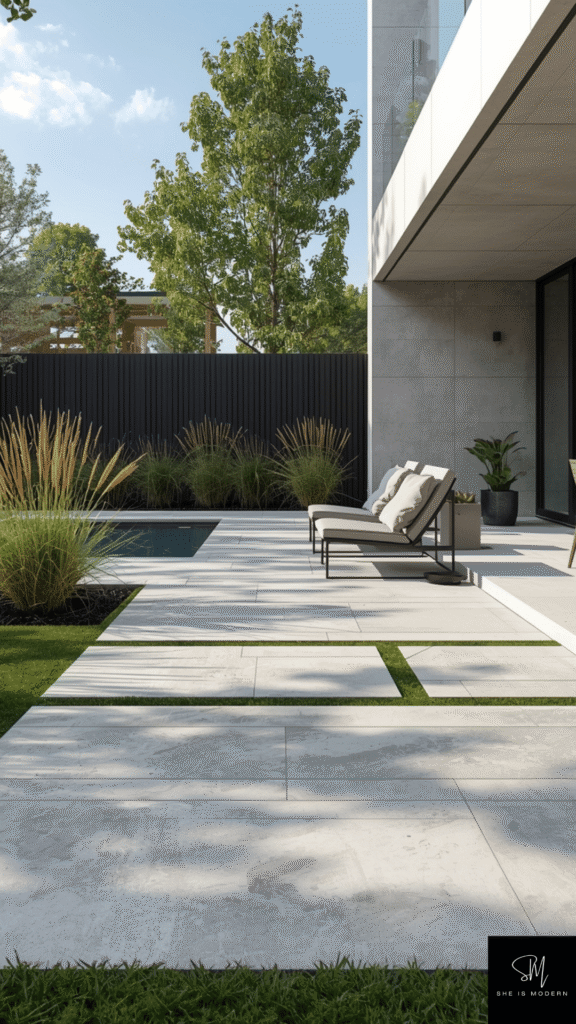 This patio idea works especially well in medium or large backyards where the wide pavers have room to stand out. Add straight line furniture, raised planters, or a built in bench to complete the modern feel. If you want a softer look, mix the patio with green grass strips or warm wood accents.