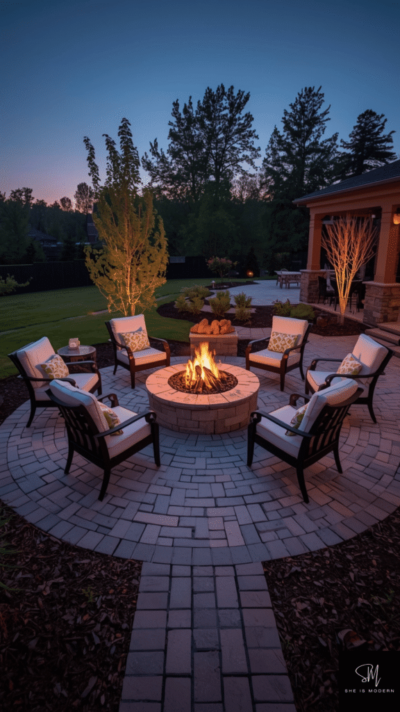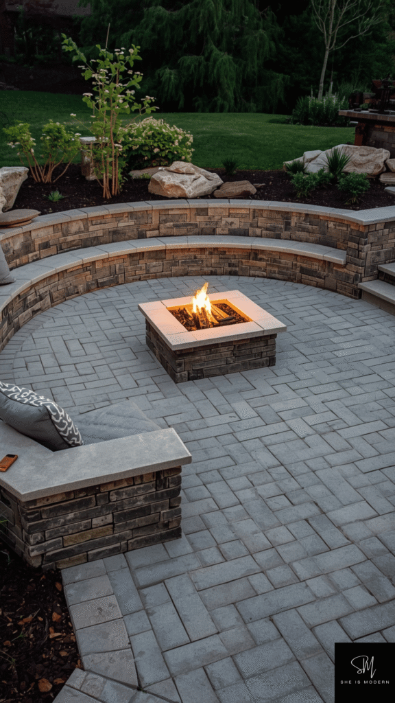 This patio style can fit many backyard sizes. In a larger yard, add multiple chairs, benches, or built in curved seating around the fire pit. In a smaller yard, keep the circle compact and use simple chairs that can move easily. Add gravel, plants, or lighting around the outer edge for extra charm.