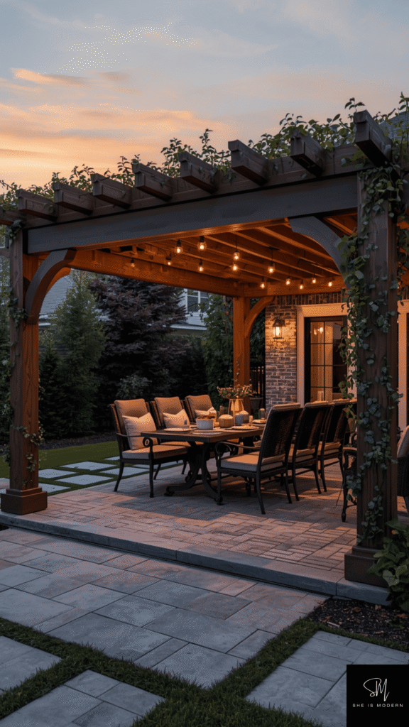 Choose pavers that match your home exterior and pergola style. Warm stone tones pair well with wood pergolas, while gray or black pavers look great with modern painted frames. Add climbing plants, curtains, or string lights to make the pergola feel softer and more inviting. A fan or outdoor chandelier can also upgrade the space.