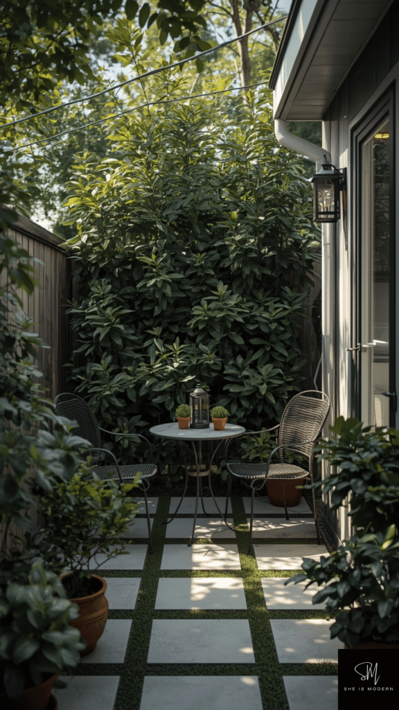 This patio idea works well because it uses space that often gets ignored. Surround the area with potted plants, privacy screens, or tall grasses to make it feel tucked away and peaceful. Soft lighting like lanterns or string lights can make the corner extra inviting in the evening.