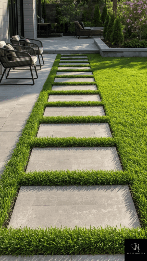 This patio style works well in sunny backyards where grass can grow healthy between the stones. Use straight rows for a modern layout or staggered placement for a relaxed style. Add simple outdoor chairs, a fire bowl, or planter boxes nearby to complete the look. Regular trimming keeps the lines neat and attractive.