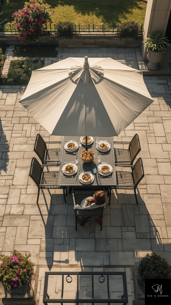 Plan the patio size around your table so there is enough room to move chairs comfortably. Add an umbrella, pergola, or shade sail for sunny days. String lights, lanterns, or candles can create a warm mood at night. Potted herbs or flowers nearby make the dining space feel fresh and inviting.
