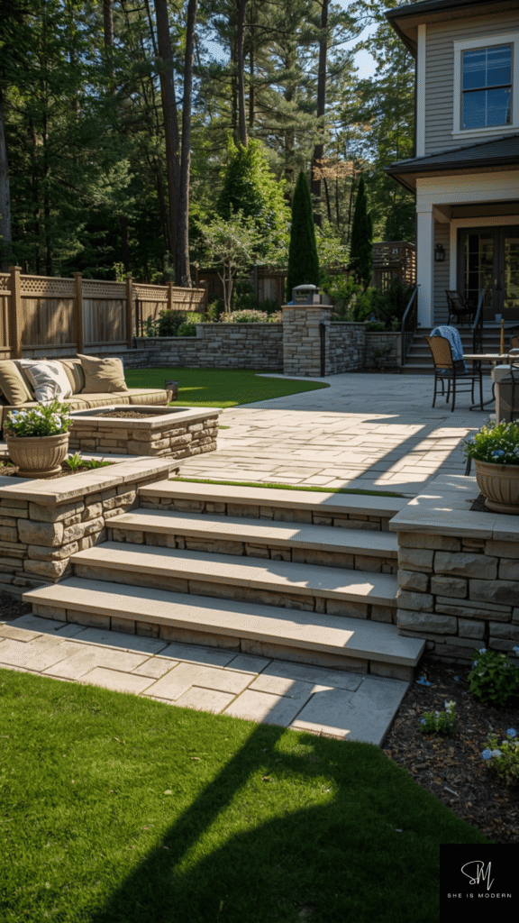 Use matching pavers for both the patio floor and steps to keep the design cohesive. Wide steps feel more welcoming and safer to use. Add railings, built in planters, or lighting along the edges for both beauty and function. This style works especially well when connecting a patio to a back door or deck level.