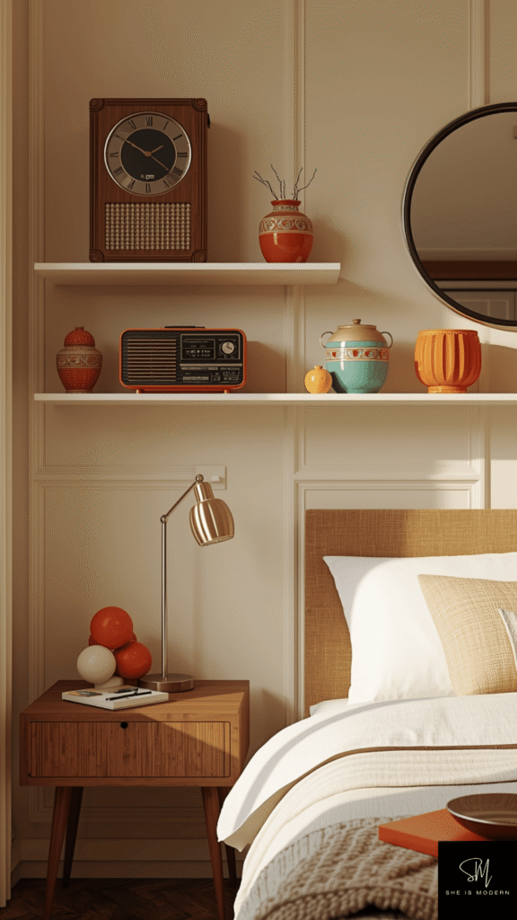 This idea is perfect for adding final touches. It brings the whole look together without big changes. Retro accessories are easy to find and simple to style, making them a great way to finish your bedroom design.