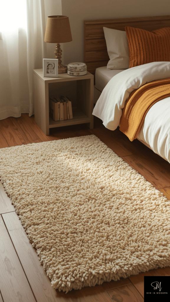 This idea is perfect for adding texture without much effort. It makes your room feel warm and complete. Shag rugs are easy to style and bring a true retro vibe into your bedroom.