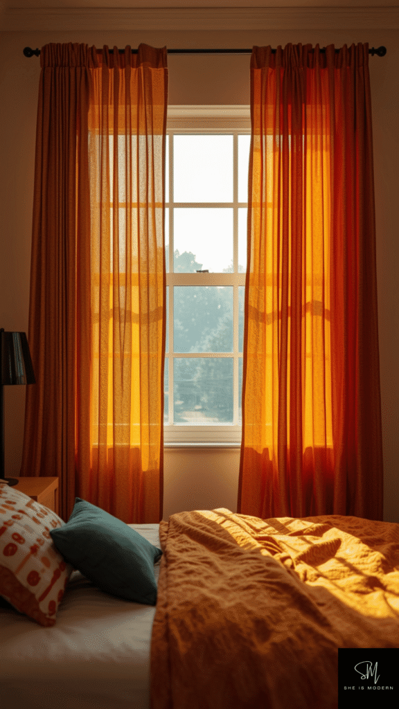 Curtains can change the whole mood of your bedroom. Retro curtains often come in bold colors and fun patterns. Think of shades like orange, mustard, teal, or warm brown. These colors bring energy and warmth into your space. You can choose patterns like stripes, geometric shapes, or even soft florals to match the retro vibe.
