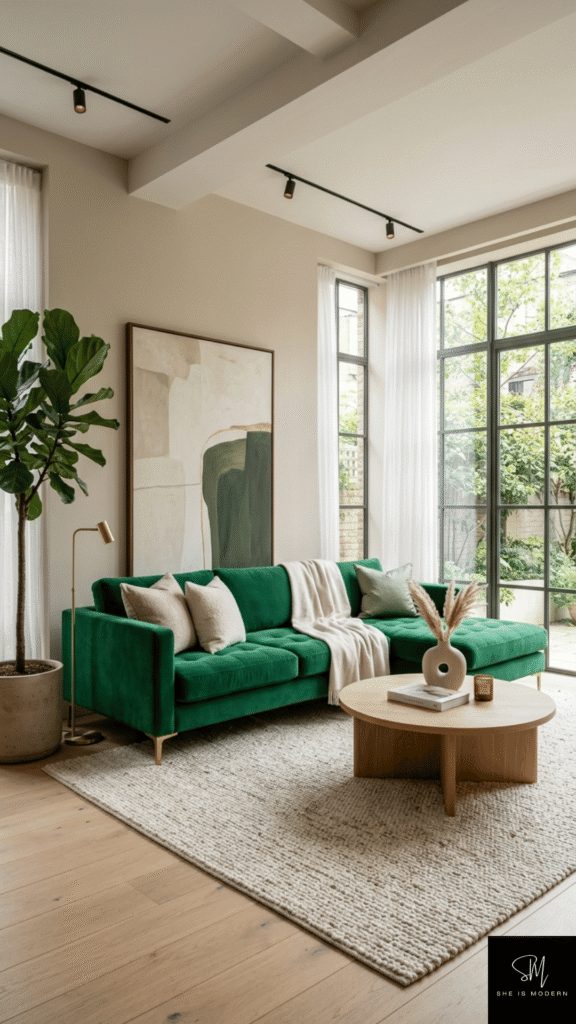 A statement sofa is the heart of any living room and one of the fastest ways to upgrade your space. Choosing a bold color like emerald green, deep navy, or burnt orange instantly creates a focal point. It anchors the room and gives direction to the rest of your decor. Even in a simple or neutral setup, a bold sofa adds depth, energy, and a designer feel without needing too many extra elements.