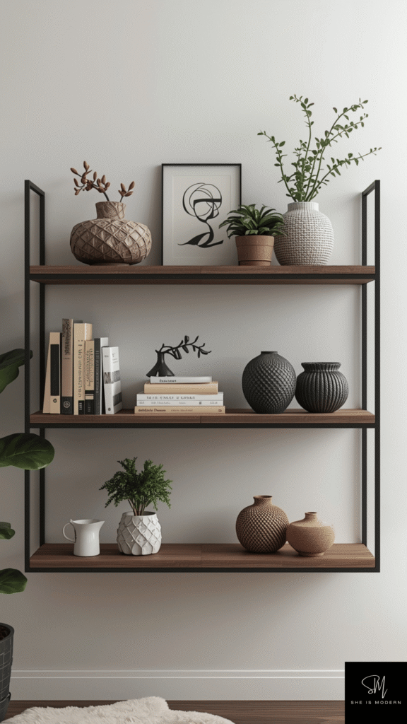When styling shelves, keep things clean and organized. Use a mix of books, small decor pieces, and plants to create balance. Avoid overcrowding, as too many items can make the space feel messy. Leave some empty space to keep the look modern.