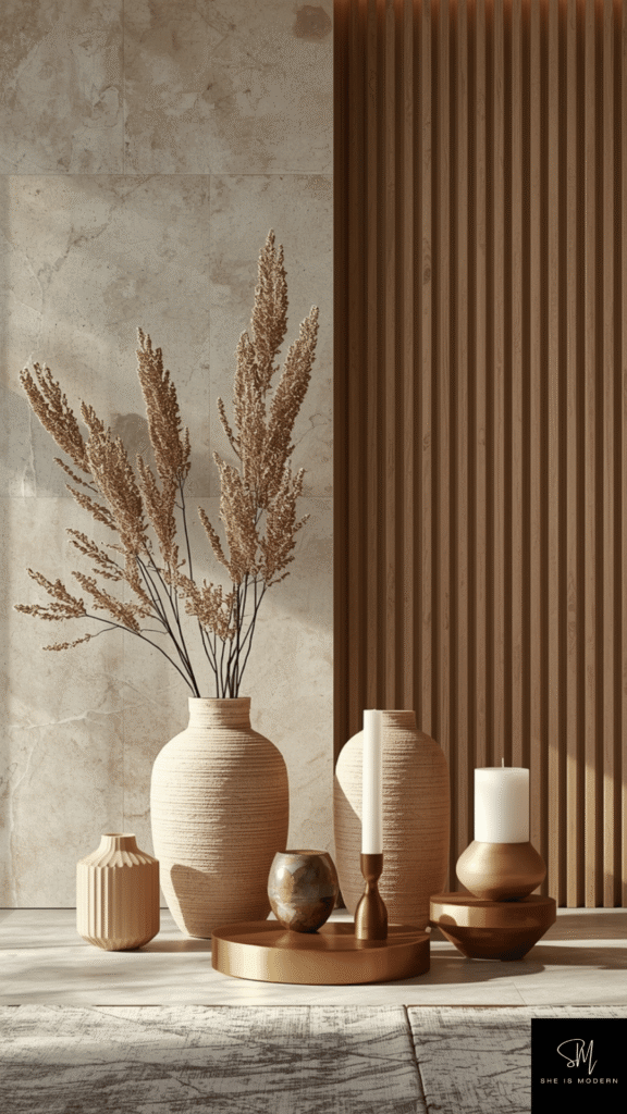 Group accessories in odd numbers for a more natural and balanced look. Mix different textures like glass, ceramic, and metal to add depth. This keeps your decor interesting without needing too many pieces. The best part is flexibility: you can switch them out anytime for a new look. Keep surfaces like coffee tables, shelves, or consoles simple so the accessories stand out. This is a quick, budget friendly way to keep your home looking fresh and trendy.