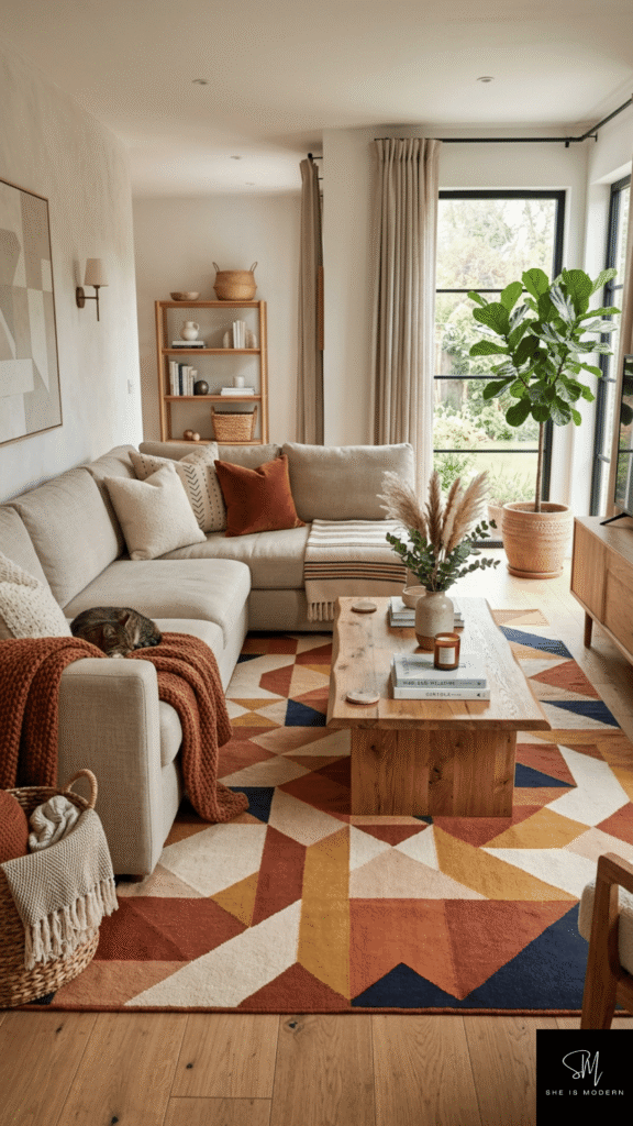 To style it well, keep surrounding decor simple and let the rug be the highlight. You can pick one or two colors from the rug and repeat them in small accents like pillows or throws. This keeps the space cohesive without looking too busy. A bold rug is an easy and affordable way to refresh your home instantly.
