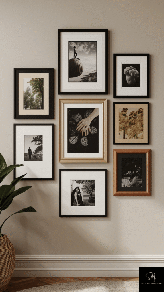Use different frame sizes for visual interest, but keep spacing consistent. You can include personal photos, prints, or even quotes. A gallery wall is flexible and easy to update, making it a fun and meaningful decor idea.
