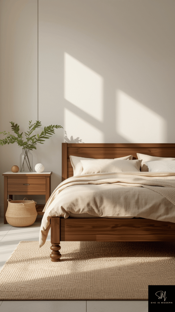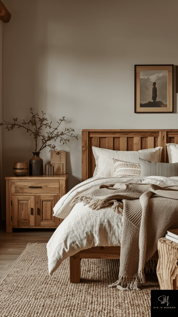 Start with wooden elements like a bed frame or side tables. Choose finishes that look slightly rough or natural, not too polished. Pair these with soft bedding in neutral tones like beige or cream. This keeps the room balanced and comfortable without feeling too heavy.