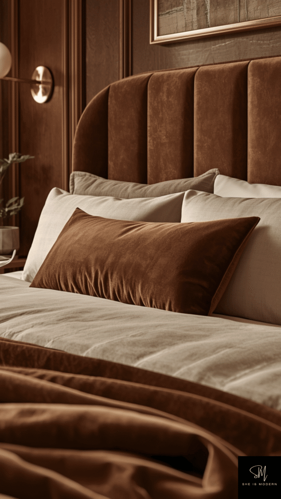 Brown velvet adds a soft and luxurious feel to your bedroom. This fabric reflects light gently and gives the space a rich texture. Even a small velvet piece can make the room feel more cozy and stylish.