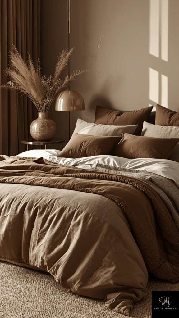 Start with a neutral base like beige walls or light bedding. Then add layers through pillows, throws, and rugs in different brown shades. Keep the colors soft and natural to maintain a relaxing look.