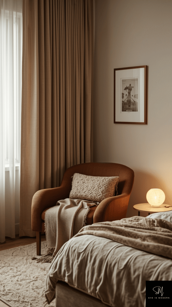 A brown cozy corner is a great way to make your bedroom feel more inviting. This small space can be used for reading, relaxing, or just enjoying quiet time. Brown tones help create a warm and comfortable feeling in this area.
