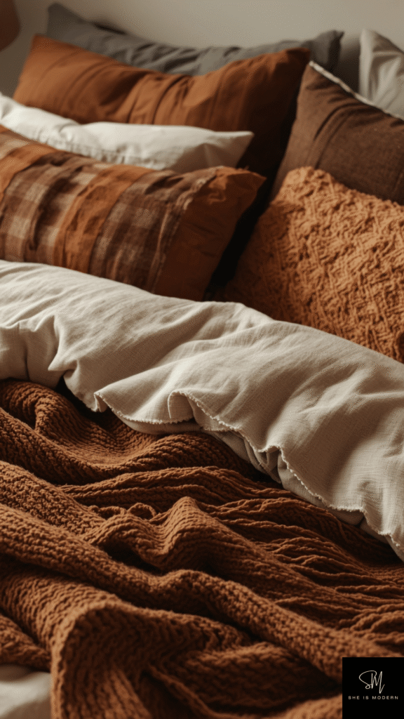 Layering different brown textiles is a great way to build a cozy bedroom. Use blankets, throws, cushions, and rugs in various shades of brown. This creates depth and makes the space feel soft and inviting.