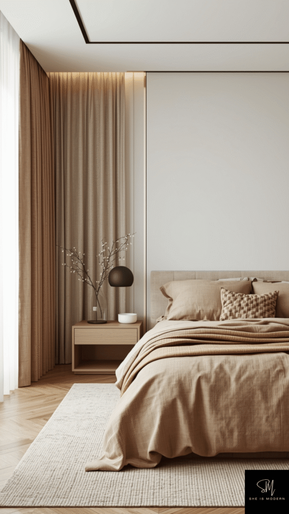 A brown and beige minimal style creates a clean and calming bedroom. This look focuses on simple design, soft colors, and less clutter. Brown adds warmth, while beige keeps everything light and airy.