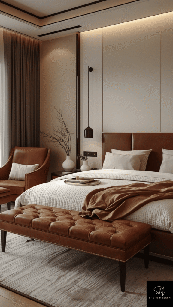 Add simple decor like a soft throw or textured pillows nearby. Keep the overall styling clean and uncluttered. Brown leather works well in both modern and rustic bedrooms, giving you a cozy and timeless design that feels comfortable every day.