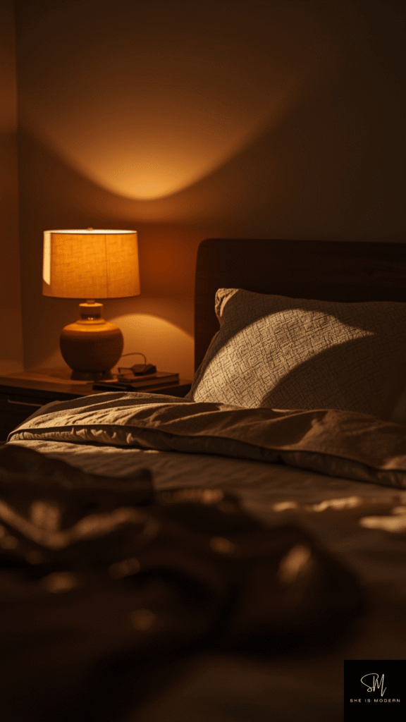 Choose lampshades in beige or light brown to soften the light. Use warm bulbs instead of bright white ones to avoid a harsh feel. Placing lights near the bed or corners of the room helps create a soft and even glow throughout the space.