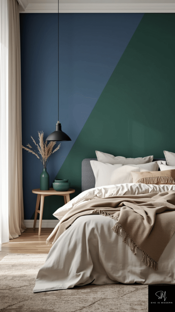 Choosing the right color combination is important. Soft pastels paired with neutral tones create a calm and relaxing feel, while bold contrasts like navy and white add a more striking effect. This style works well in both small and large bedrooms and pairs well with other creative bedroom paint ideas.