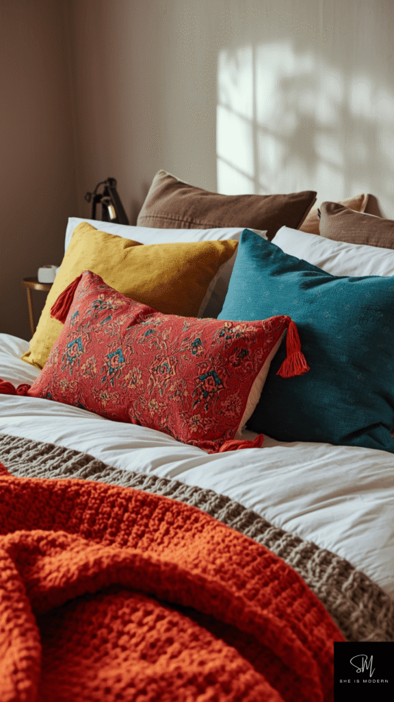Colorful throw pillows are one of the easiest ways to refresh your bedroom. You can mix different colors, patterns, and textures to create a lively and cozy bed setup. Shades like coral, mustard, teal, and soft pink work well together and instantly make your space feel more inviting. Even a neutral bed can look stylish with the right combination of pillows.