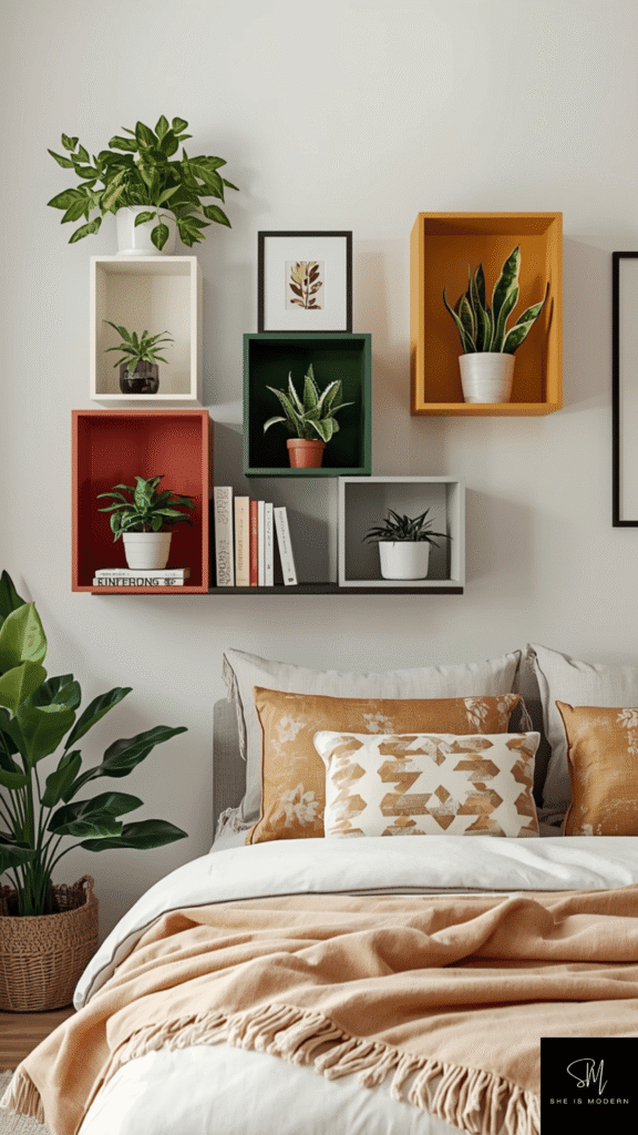 This idea adds personality without taking up extra space. It is perfect for small bedrooms where you want both function and style. Multi color shelves make your room feel creative and visually interesting.