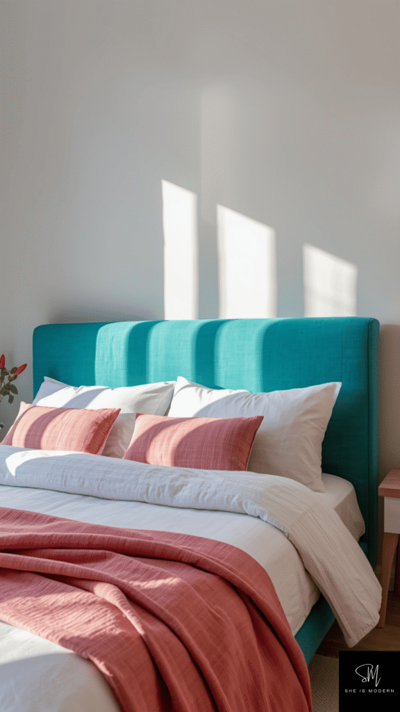 This idea is great if you want a strong focal point without repainting walls. A bright headboard is both stylish and practical, making your bedroom feel more complete and visually appealing.
