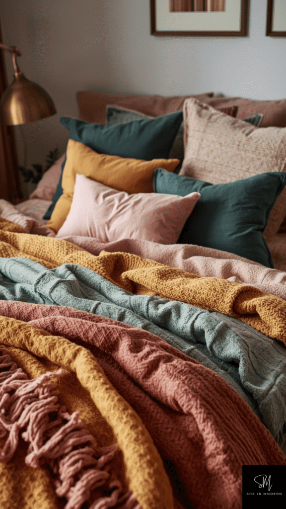 The key is to mix colors in a balanced way. Choose two or three main shades and repeat them across different pieces. This keeps the bed looking styled instead of messy. Adding different textures like cotton, knit, or velvet also helps create depth and comfort.