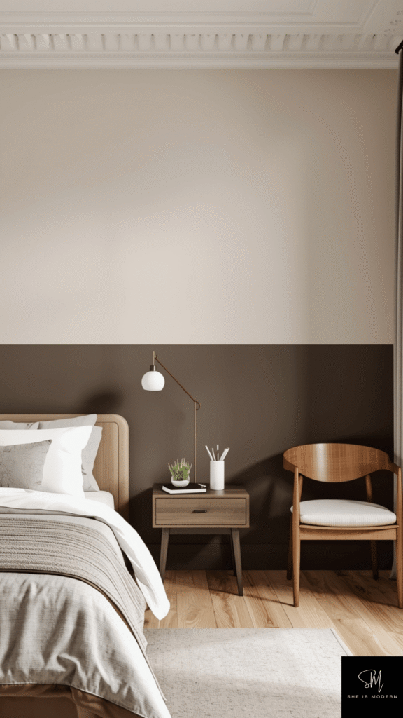 You can also use a clean line or a slight curve where the colors meet for a unique touch. Adding simple decor like frames or shelves on top of the design can enhance the look even more. Two tone walls are a stylish way to experiment with color in a controlled way.