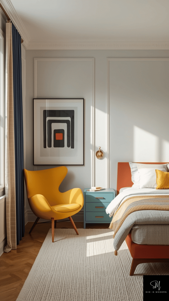 This idea works well for renters or anyone who prefers easy updates. You can change or move furniture anytime without much effort. Bright furniture adds personality and makes your bedroom feel more unique and energetic.