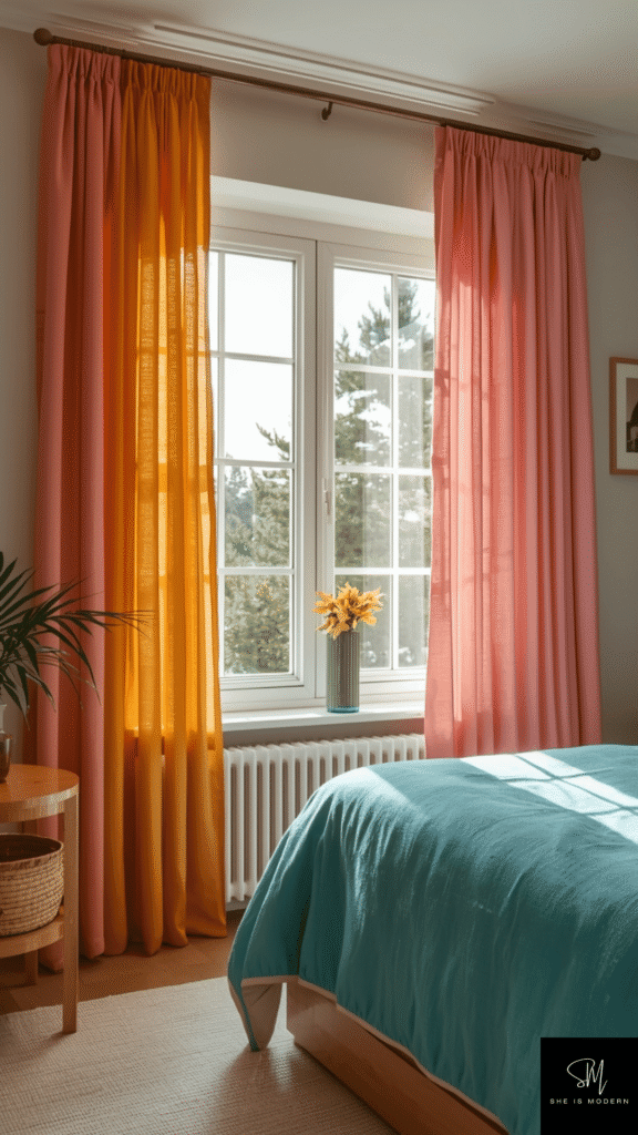 Curtains also affect how light enters the room. Sheer colorful curtains give a soft glow, while thicker ones create a cozy feel. This idea is simple, affordable, and easy to update whenever you want a new look.