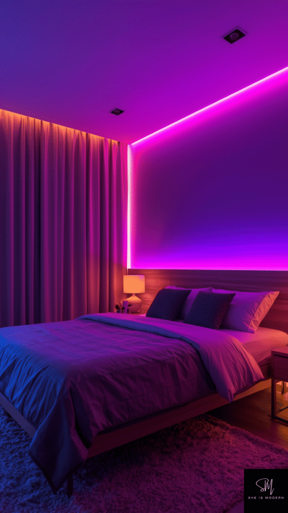 Colorful lighting is perfect for adding a unique and creative feel to your space. It is easy to install and does not require big changes. This idea works well for anyone who wants a modern and stylish bedroom with a soft and calming vibe.