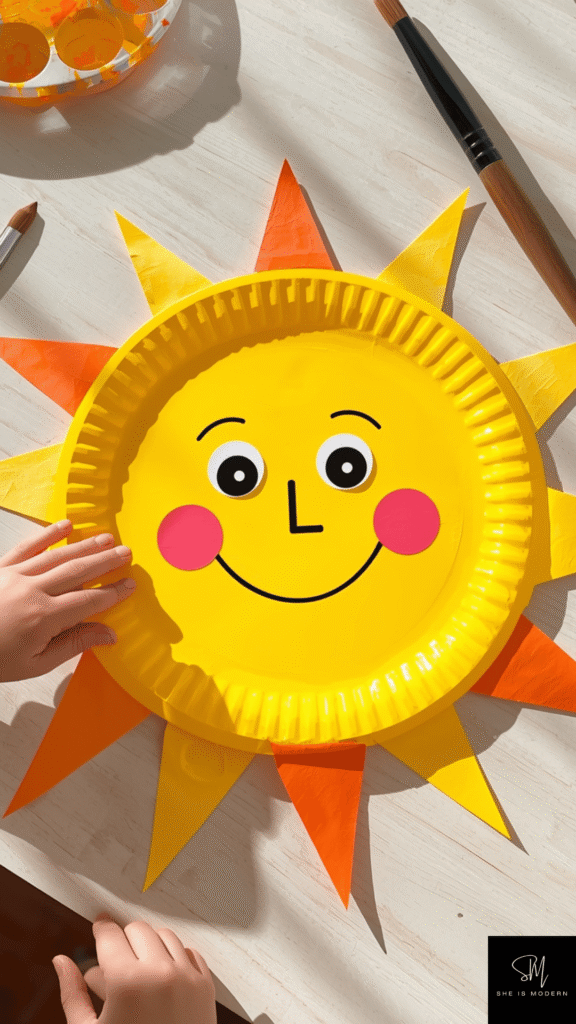 A paper plate sun is bright and cheerful. Kids can paint the plate yellow or orange. Let it dry fully before moving to the next step. Then cut out triangle shapes from colored paper to make sun rays. Glue them around the plate edges. This craft helps kids learn colors and shapes in a fun way.