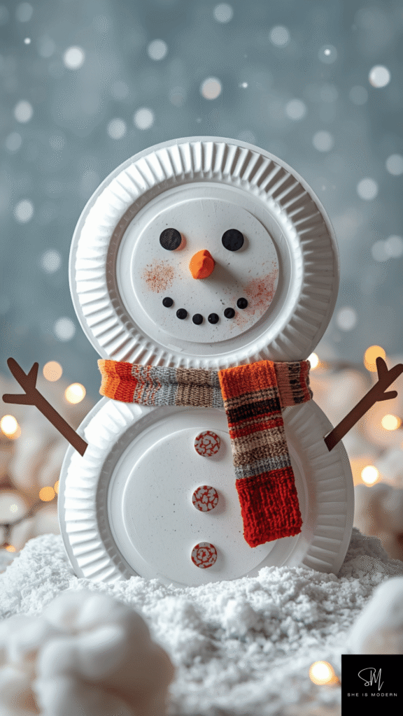 This snowman craft is cozy and perfect for winter activities. Use white paper plates or paint them white if needed. Stack two plates to form the snowman’s body and glue them together. Kids can help with positioning and pressing the plates, which builds coordination and teamwork.