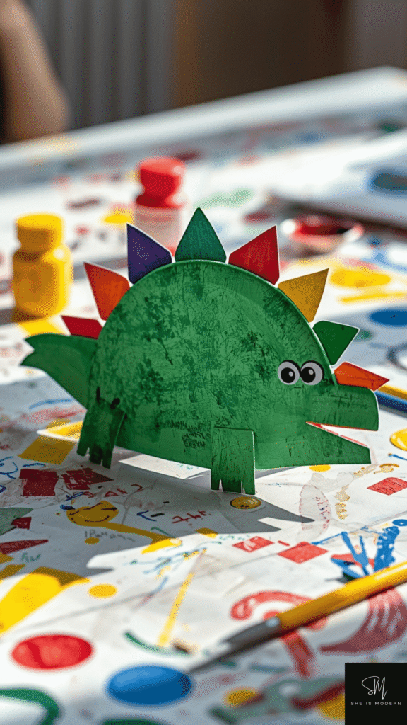 Next, cut out dinosaur spikes using colored paper and glue them along the back of the plate. Add legs, a tail, and a head if you want a full body design, or keep it simple with just a face. Draw or stick on eyes and a big mouth. Kids can make friendly dinosaurs or scary ones. This helps build creativity and storytelling as they imagine their dinosaur world.