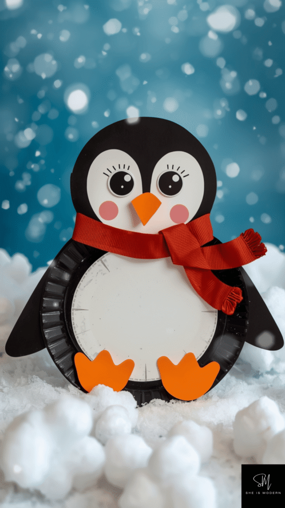 Cut out a small orange triangle for the beak and two orange feet. Glue them in place and add googly eyes or draw eyes with a marker. Kids can also add extra details like a scarf or hat to make their penguin unique. This gives them freedom to personalize their craft and use their imagination.