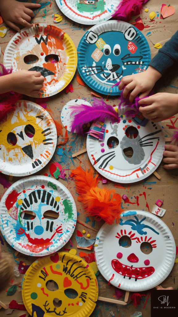 Paper plate masks are perfect for pretend play. Cut out holes for eyes and decorate the plate. Kids can create animals, superheroes, or funny faces. Paint, crayons, and feathers all work great.