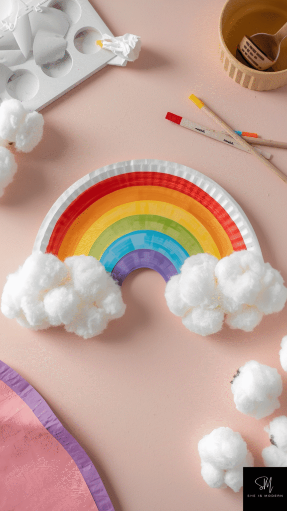 Once finished, you can hang the rainbow on a wall, window, or classroom board. It instantly brightens up any space and gives a cheerful vibe. You can also connect multiple rainbows together to make a large decoration piece. This craft is perfect for younger kids because it’s simple, colorful, and very rewarding to complete.
